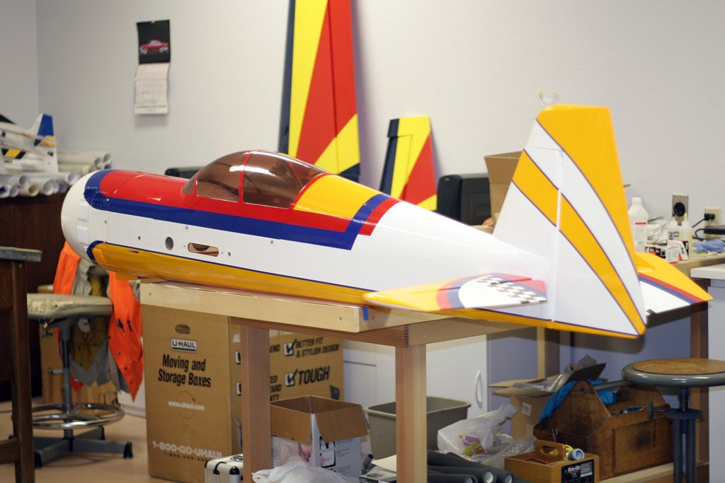 Here’s the plane, showing the cutouts for the rudder servos, receiver, batteries, tanks, et al… pre done: