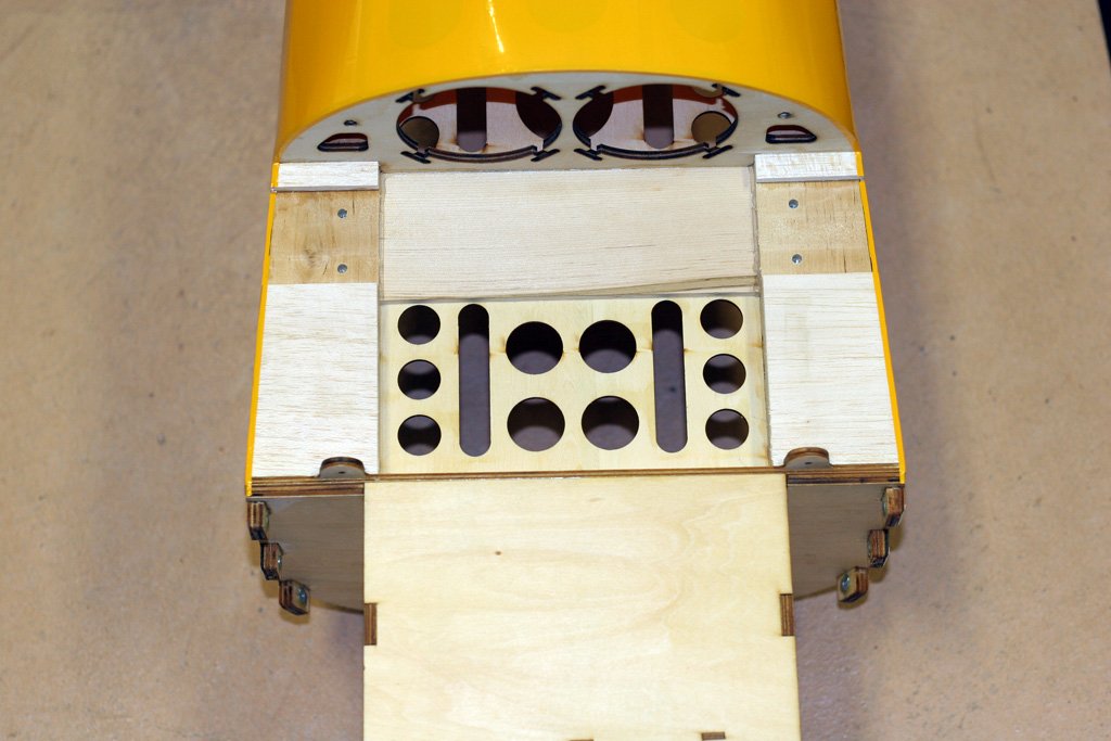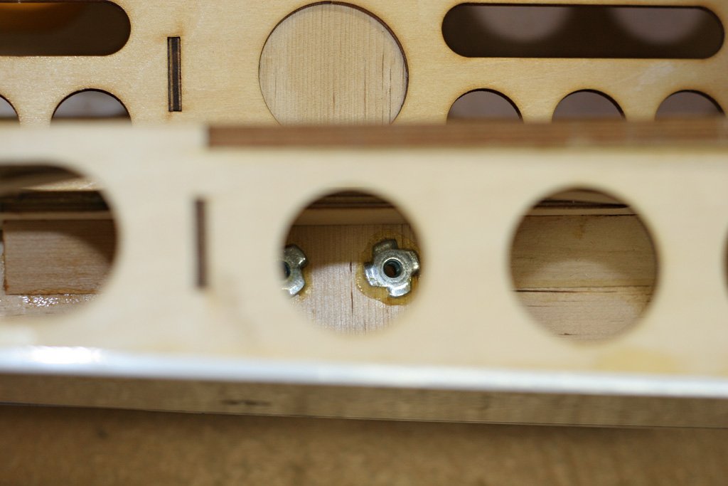 A shot from the top and also a shot showing the pre-installed and glued in blind nuts for the landing gear (again going through a double layer of 1/4″ hardwood that has alot of coverage or shear strength):