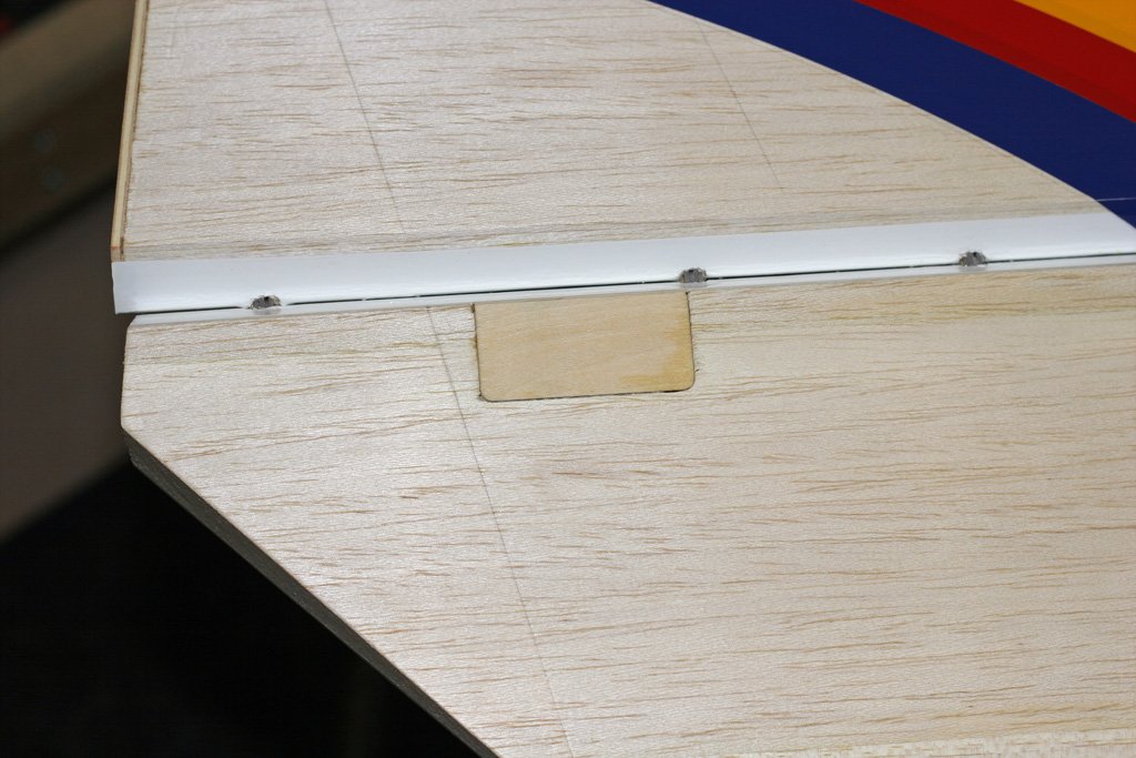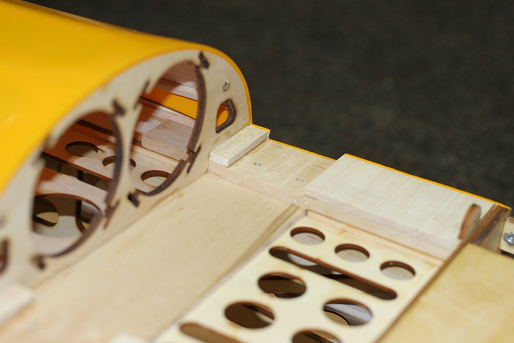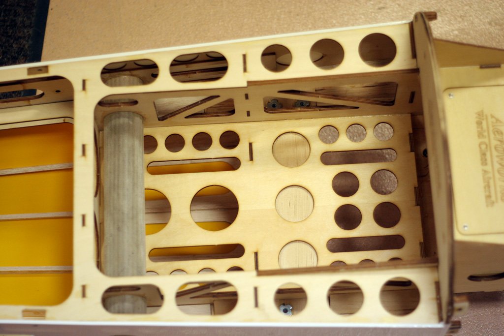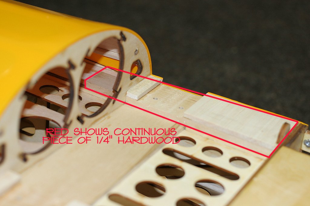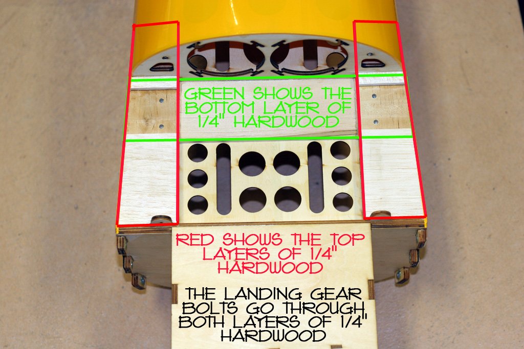 I was asked about the landing gear plate and I’d have to say it looks pretty stout. It’s a continuous piece of 1/4″ hardwood side to side… with two perpendicular pieces of 1/4″ hardwood glued to it. Those side pieces pick up alot of surface area and really shear the whole thing solid. The landing gear bolts go through the overlapping area which is 1/2″ thick, and again has its load spread out pretty far and wide.