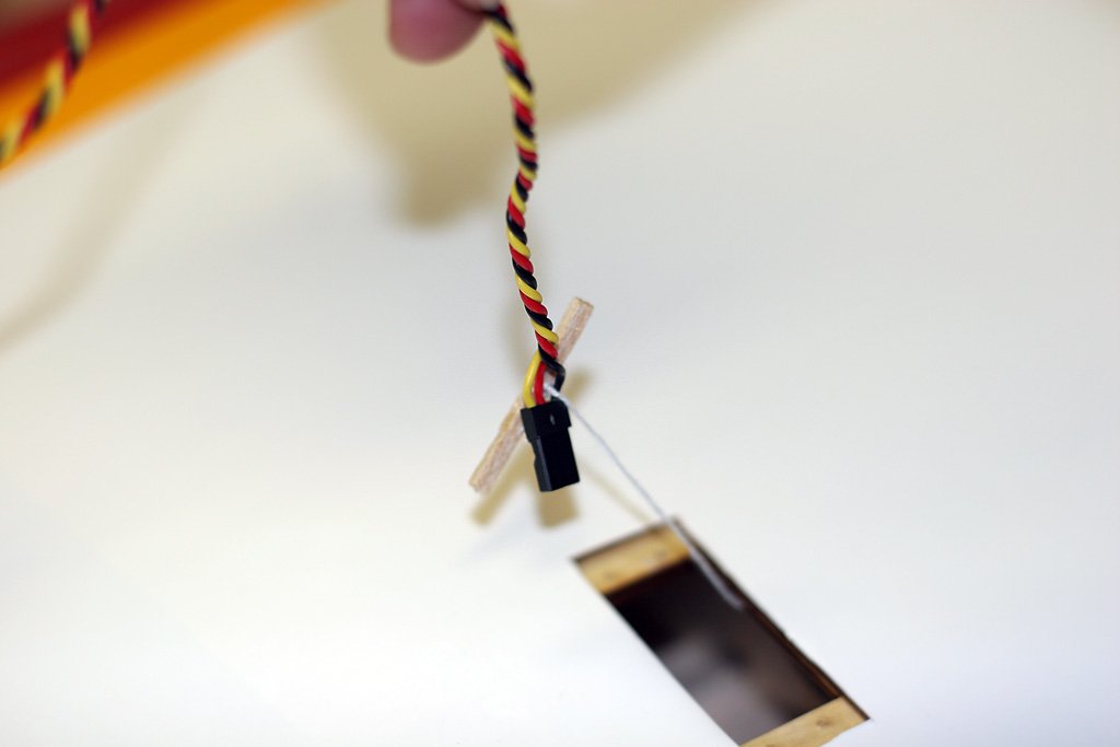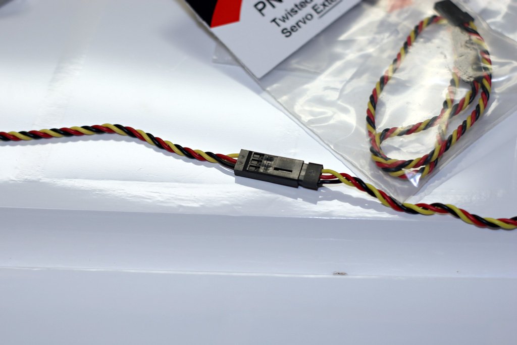 Aeroworks leaves strings in the wings for pulling the aileron servo extensions through. Mark was showing me his method for using them… fine for this plane as there is no drag and lots of room in there… but I wouldn’t do it on a wing with less room inside. ‘Course, come to think of it, I’ll probably cut those connectors off in favor of Dean’s 1003s anyway… so it really doesn’t matter how much abuse they take: