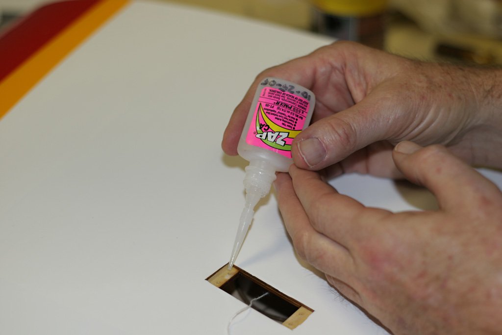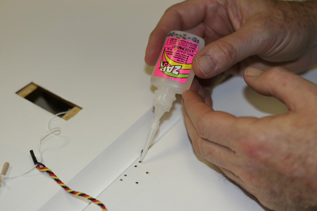 Mark’s busy on the second wing now… he used ZAP thin CA glue in all the wood screw holes (for control horns and servo mounts). This strengthens the wood up quite a bit. Again, under the servo pockets here, is another layer of ply that I usually have to cut and glue in, but Aeroworks has taken care of that already… along with so many other steps that I usually have to take to assemble an ARF. But, this ain’t just an ARF, it’s a “QB” :