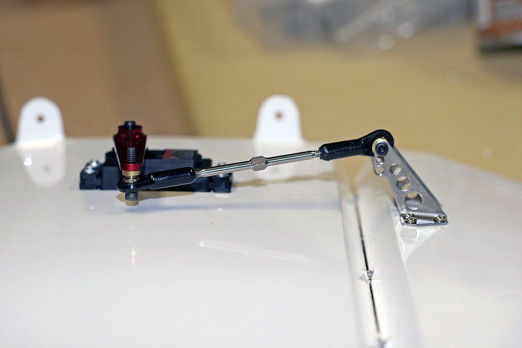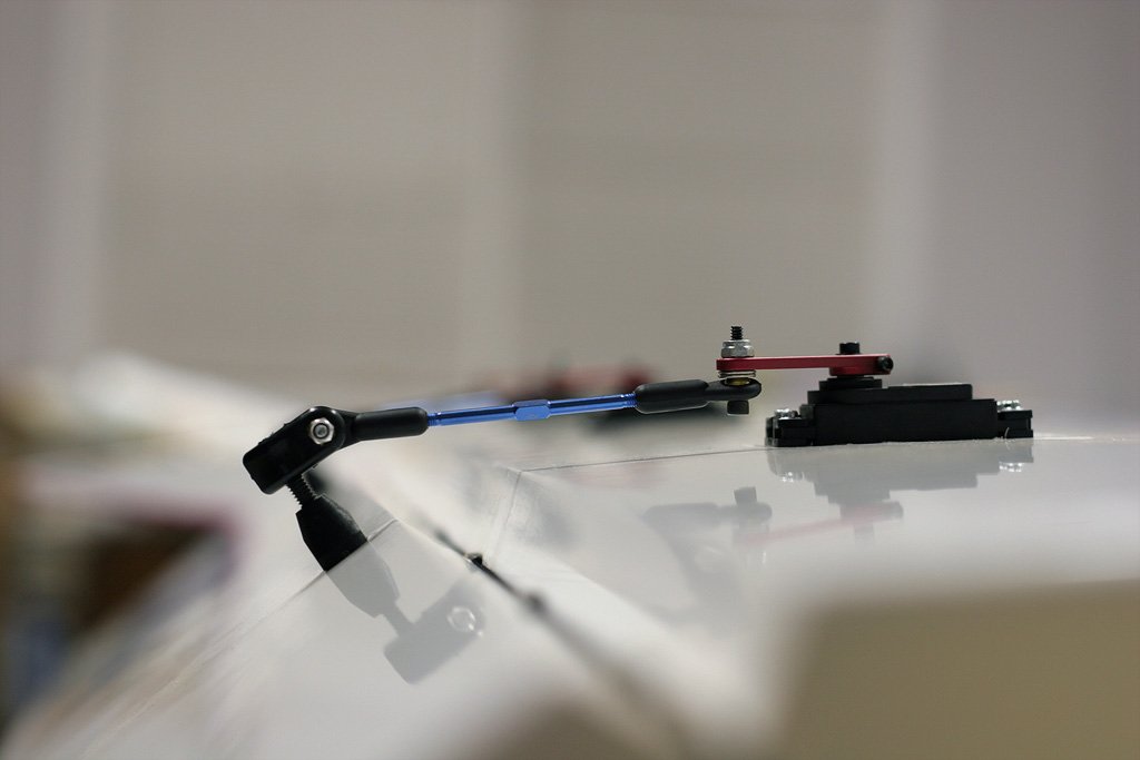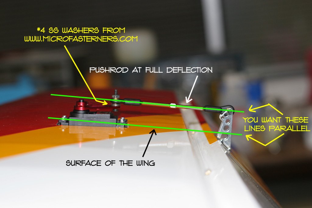 Once you establish your control horn height to get between 50-55 degrees each direction off center to achieve the max travel you, personally, will need… then getting the pushrod to be parallel to the wing surface at full deflection becomes a matter of how high to have the pushrod on the servo side. The means for adjusting that height is with which servo arm brand you use and whether or not you put the pushrod/balljoint on top or underneath the servo arm. In the picture below I have the pushrod underneath the servo arm to get the geometry I’m looking for. Additionally, I’ll use spacers… the included conical (comes with balljoints), one washer, two washers, whatever… to get the height I want and also be free of binding (balljoint to servo arm) throughout the range of travel: