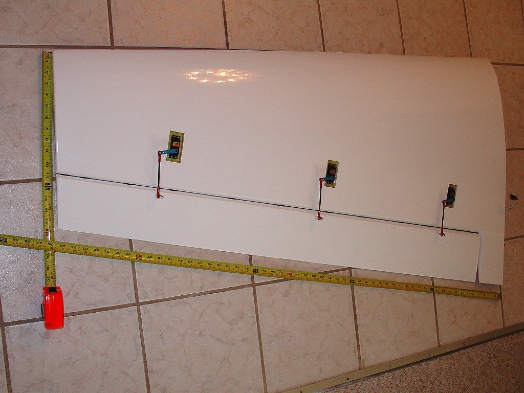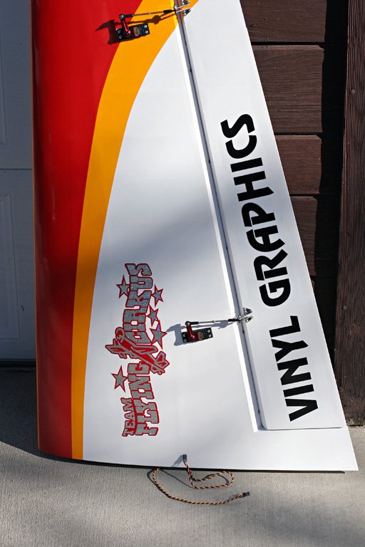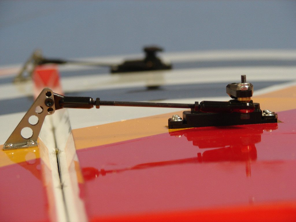 One final point on this comes up when people tell you that the pivot point of the control horn should be in the hinge line. Well, that is another reason I do things the way I do. You see to get in the hinge line you have to have a control horn that has alot of offset from it’s bolt down location, due to the bevel. Well, on 40% that bevel gets pretty big and you are looking at a big offset to get to the hinge line. I don’t like a single bolt style control horn sticking that far out, looks like trouble to me. I accept the 3/8″ offset from a rocketcity style and no more. This makes control horn pivot point to hinge line center offset a given for me. Now, the style horns Aeroworks is using here, they are stout even offset way out there. But, the problem with them is that they do not have a find adjustment for height, only a course adjustment. So, unless I have that style custom made for each of my planes, I’m going to have offset. Aeroworks, building this plane from scratch, was able to work out good geometry with this horns, that’s why I used them. Now, if Aeroworks had the outboard servo just a couple inches closer to the root they’d be perfect, 50/50, 50/50 on the two aileron servos. But, it’s almost perfect, and plenty close enough.