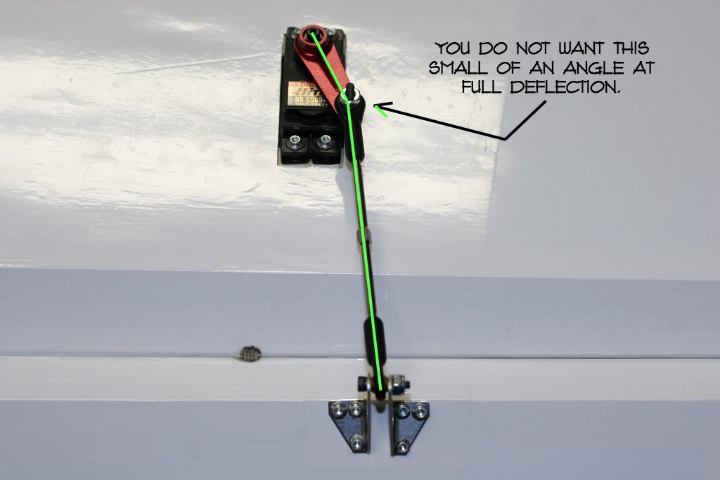 Back to geometry consideration #1. If you don’t have a decent angle at full deflection you will be prying on the servo output gear (case failure, gear failure, plane failure, etc.):