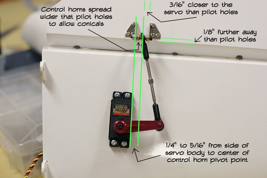 Couple things I’m always looking to achieve with the geometry… 1) is the control horn in the right place to keep some angle between the servo arm and the pushrod at full deflection (this avoids leverage against the output gear that leads to case damage, loss of torque, failures, etc; and also situations where one servo goes past parallel and gets stuck there when a ganged servo moves back to center. I’ve seen these types of failures, and also the people that set them up blaming the manufacturers.) And, 2) the pushrod being parallel with the wing surface at full deflection (avoiding prying leverage against the output gear which also leads to case damage, loss of torque, failures, blaming the manufacturer, etc.):