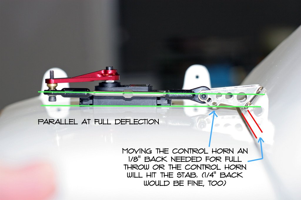 While we’re on the subject. I worked out an elevator today/yesterday. I shot for 60 degrees each way (120 degrees total), but would have to have a slightly taller control horn or slightly shorter servo arm to get it. I got 58/58 and it came out correctly… but I could get 60/60 if I either drilled the servo arm or went rocketcity style on the control horn. Again, I’m happy to get 50-55/50-55, you have to be very precise to get 60/60. Here it is: