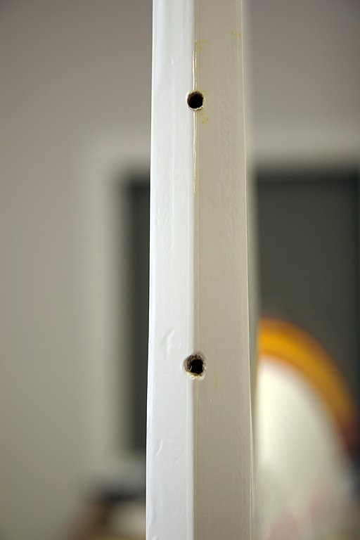 I used a 9/32″ drill bit to widen out the pre-drilled hinge holes for the hinge knuckles. I only drilled in 1/8″ and I ran the drill in reverse for the drill’n. Now Dunny had some way of using the dremel and making it come out real clean, I’ll have to ask him what he does. But, this worked out okay for this one (although I’m not sure I can recommend it as the drill could get away from you pretty easy)… the top hole is factory, and the bottom hole is slightly drilled out for the knuckle: