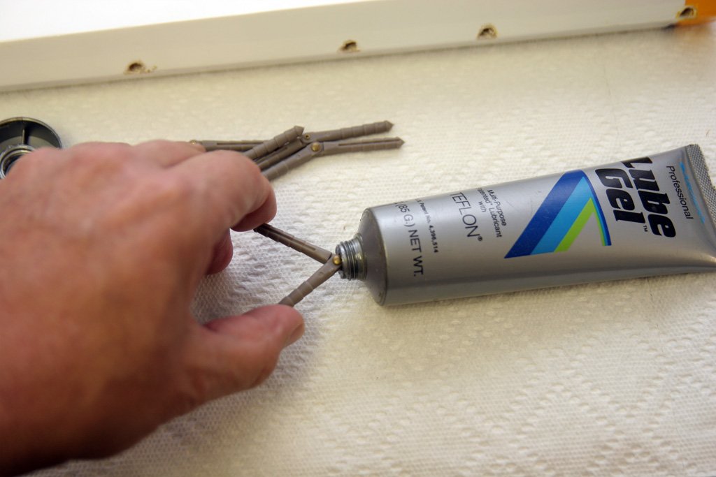 After I had the holes how I wanted them I got the hinges ready. I lube the knuckles up with teflon lube… not just any teflon lube as you can see, but rather “professional” teflon lube. lol I lube up the knuckle real good, making sure there is lube in the hinge and also on each side of the hinge pin. I make sure to keep my hands very clean and also not to get any lube on the part of the hinge that gets glued in. Probably not a bad idea to scuff the hinges up and clean them with alcohol… but my hinges have held up rock solid without doing that, knock on wood: