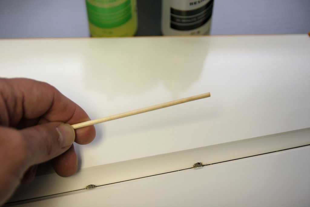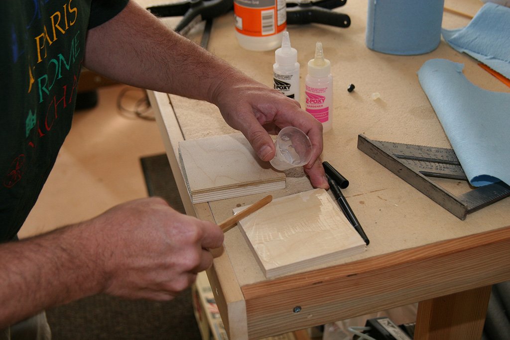 From my plaster’n days I think it is important to have pressure to get a good bite. Whether that is true or not I don’t know, but I know I’ve never had a hinge I glued in come out. lol What I like to do is apply pressure to the epoxy going inside the hole and pressure to the epoxy going on the hinge. What I mean is I use a stir stick to press epoxy onto the insides of the hole… and also use a popsicle stick to press epoxy onto the hinge. Then I push the hinge in the hole: