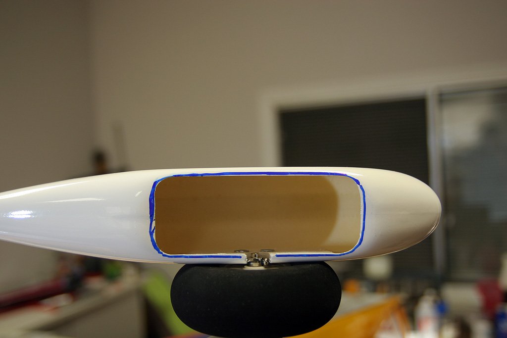 Here’s the plane, showing the cutouts for the rudder servos, receiver, batteries, tanks, et al… pre done: