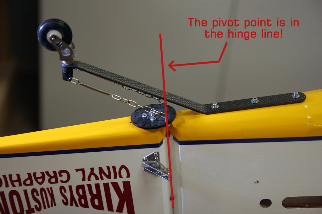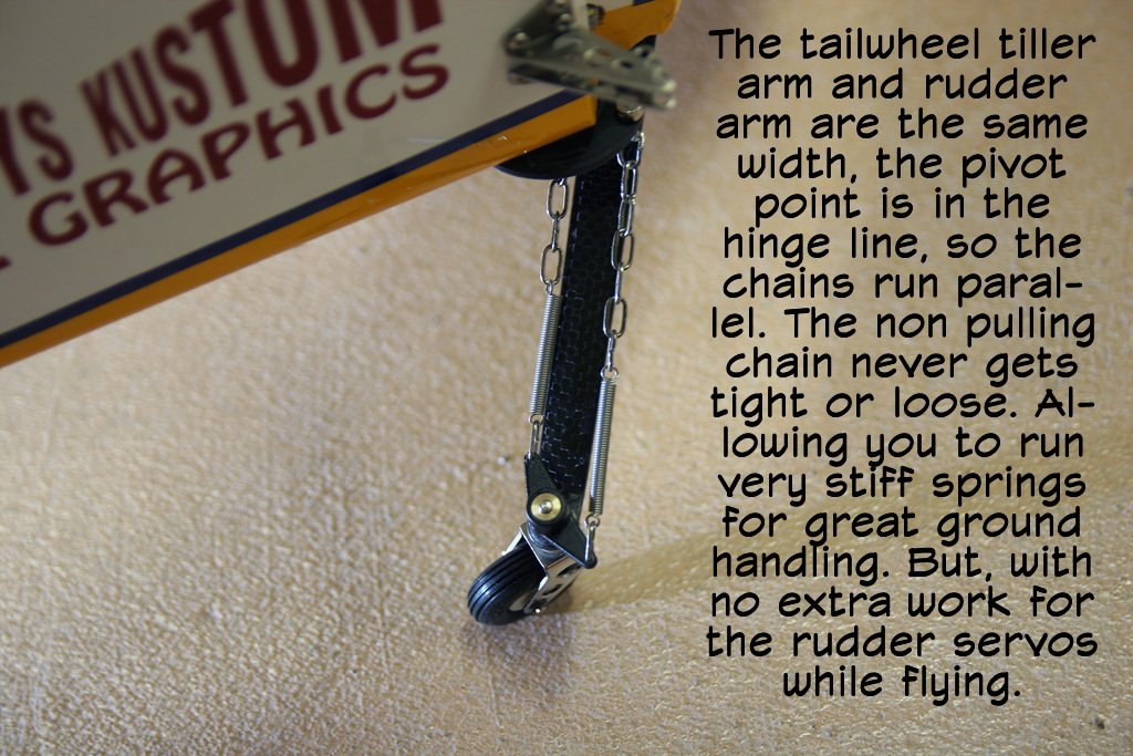 The Aeroworks arm is too wide… it will get you fast ground handling in low rate rudder, but with a price… the price being when you are flying, your rudder servos will have to overpower the tailwheel springs to move the rudder. That wears out your servos and batteries. Consequently most flyers use soft springs, which gets you back to bad ground handling. Get your geometry right and you can use super stiff springs for the greatest ground handling you ever had, you can even go with no springs at all! Best of all, no binding in the air, no extra juice needed to overpower the springs… the rudder servos should only be dealing with the force of the air, not also pulling on springs to get you the rudder deflection you’re asking for. Doh! lol: