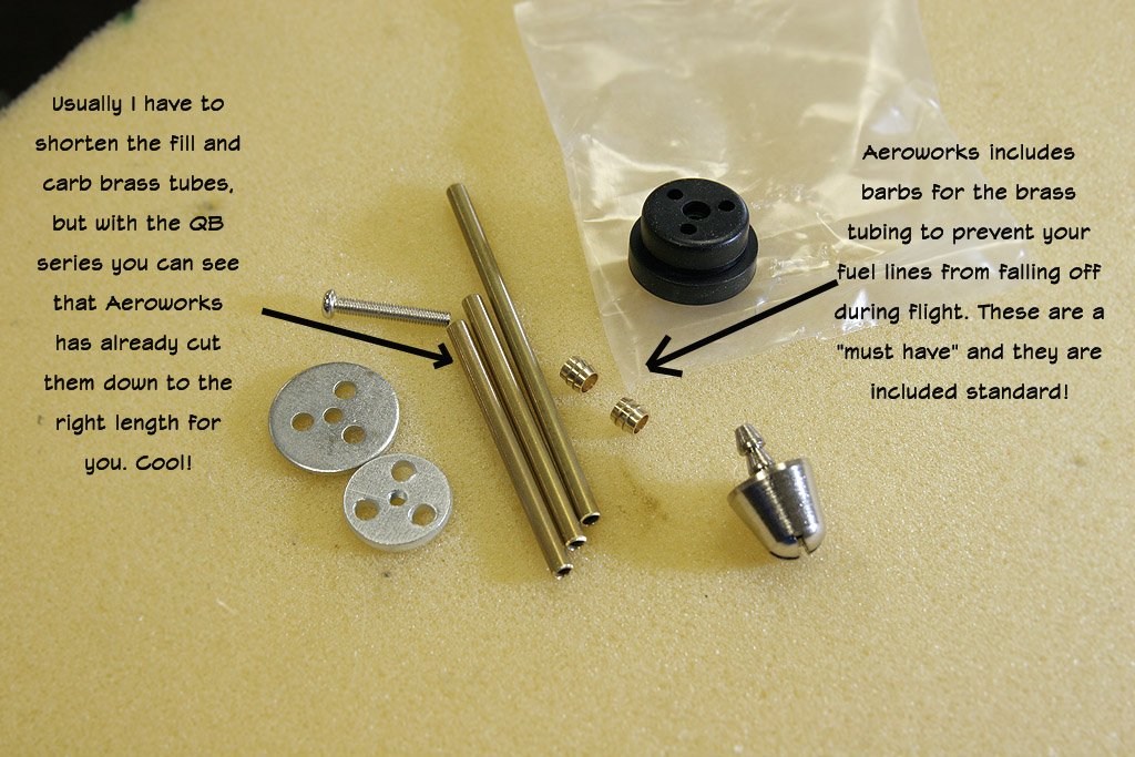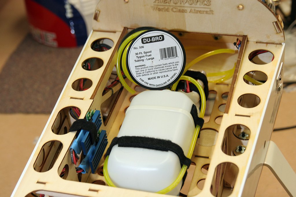 I used the DUBRO tank and gas stopper (the brown one), but used the 1/8″ tubing from the Aeroworks tank. It is already cut to the lengths I like, so that saved a step. I also used the Aeroworks solder on barbs to keep the fuel line from ever coming off in flight (I usually use the DUBRO barbs, but this is the first ARF I’ve ever seen that has barbs included). Here is the the 3-line tank setup I always use (it has never failed me):