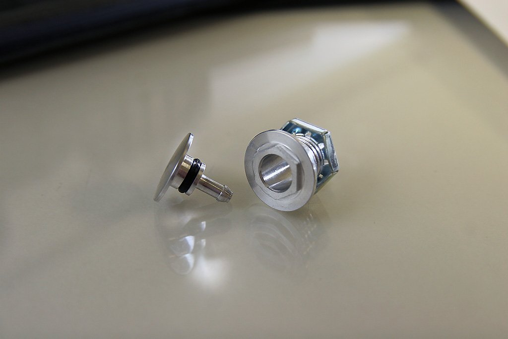 Aeroworks includes button allen head machine bolts for the wheel pants. With the blind nuts already in place. Real nice and just how I would set it up. These bolts look better than the bolts I use and will work fine. But, again, I find it easier to deal with socket heads. So, these bolts and washer are installed temporarily, but I will change them out for 4-40 SS socket head machine bolts with #6 SS sealing washers: