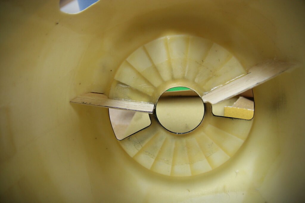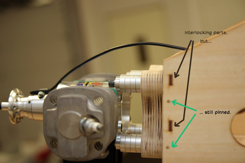 I was asked about the landing gear plate and I’d have to say it looks pretty stout. It’s a continuous piece of 1/4″ hardwood side to side… with two perpendicular pieces of 1/4″ hardwood glued to it. Those side pieces pick up alot of surface area and really shear the whole thing solid. The landing gear bolts go through the overlapping area which is 1/2″ thick, and again has its load spread out pretty far and wide.