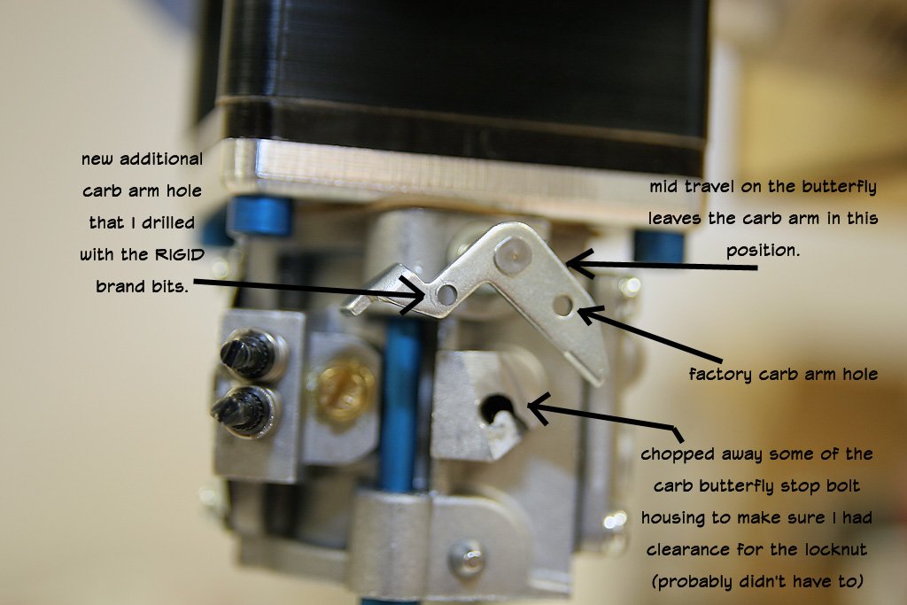 Me and Dunny have been having a hard time finding anything we need at the Home Depots, et al, up here in these parts. But, HD came though for me with these today. I’ve never been able to drill these hardened steel carb arms before… so the only way I was really happy with them was if I went and had the extensions I made for them welded on. But, no more, these bits drilled the hardened steel just like a tick into a country hog. I will no longer dread this part of the assembly process (of course EVO puts a nice 3 hole aluminum arm on their carbs making it a moot point if you have one of those engines):