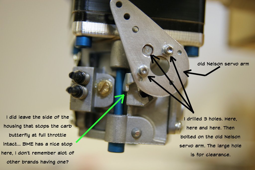 You see, I gotta little crazy on this one. lol I wanted the separation I already had between the location I had the ignition and the location I had the throttle servo. So, I wanted the carb arm on the same side and not the opposite side like the new carb has it. But, there are serious clearance issues with running it on the other side. And, as I said earlier in the thread, I did melt a balljoint once when it was too close to the exhaust (my heatgun will melt a balljoint in no time). So, I wanted to go opposite side carb arm than BME set it up, I wanted to go metal clevis so it had no chance of melting, and I wanted to go composite arm to avoid metal to metal noise. I must add that a balljoint on the BME setup carb arm on the new BME carb will work just fine (and I could have relocated my ignition), and I’ve even used metal arm to metal clevis setups before on other planes (balljoint on the opposite side)… but in an ideal world I wanted it composite arm, opposite side. lol So, I took the time to do it… which like I said, is a little crazy. lol