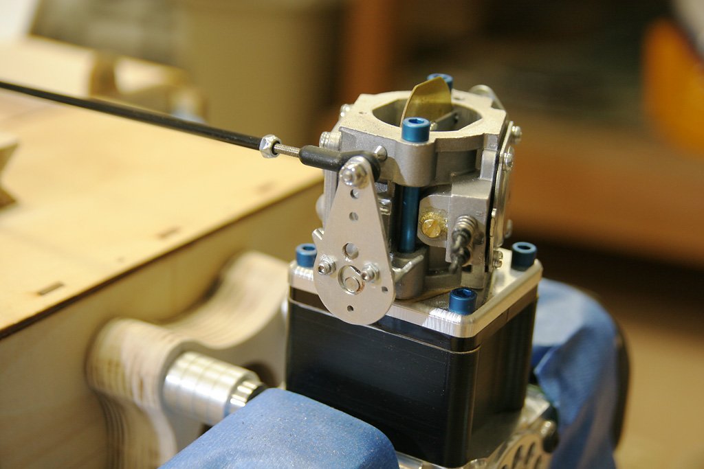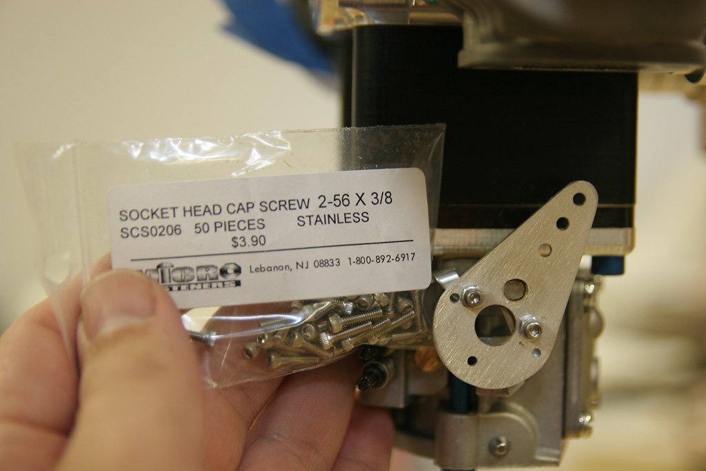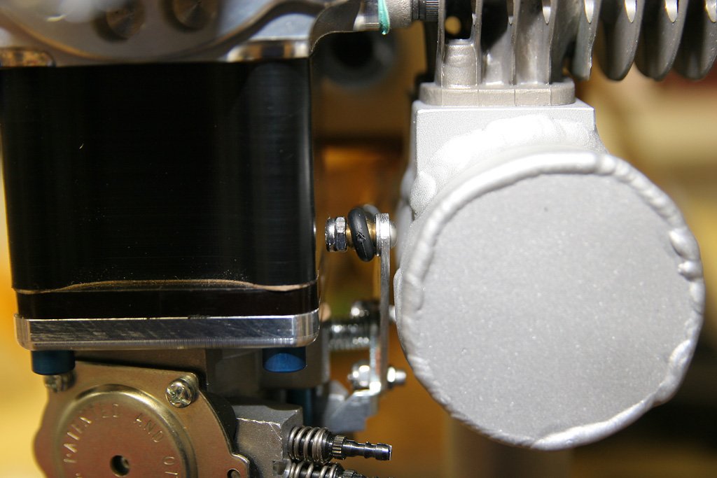 But, I decided to change it. I mounted the throttle arm down instead of up. The arm is 1-3/8″ long pivot point to pivot point. The servo arm is 1″ long. With that I got 120/120 ATV on an unprogrammed servo. That’s real nice resolution. I can get up to 127/127 ATV and still have the leverage to tightly shut the butterfly, I’d have to have gone about 1-7/16″ on the throttle arm. But, I’ll take 120/120 ATV: