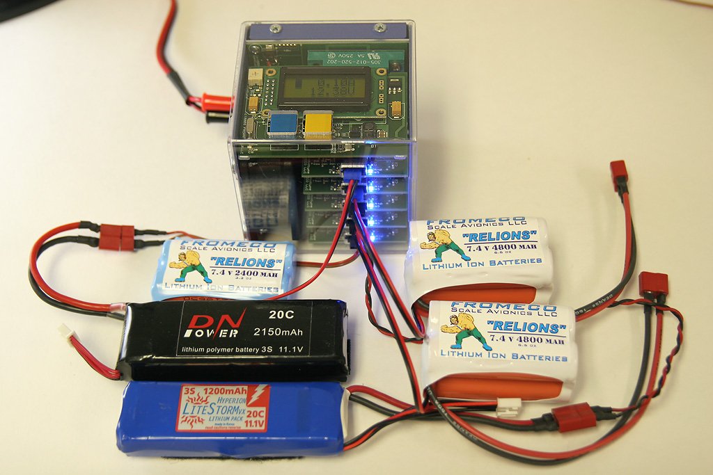 I have the 1200mah Lith-poly charging at 1amp, the 2600mah Lith-ion “grunt” charging at 1.5amps, the 2150mah Lith-poly charging at 2amps, and the 5200mah Lith-ion “grunt” packs charging at 3amps each. The charger auto-sensed the cells (i.e, 2S or 3S) and asked me what amperage I wanted to charge them at. Too cool: