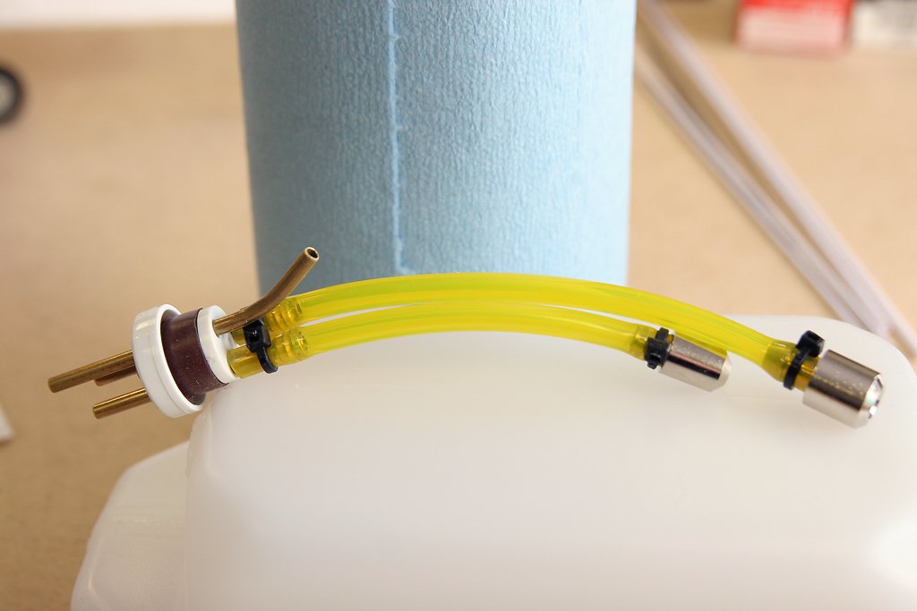 I also ran the vent line out the bottom of the fuse using the Aeroworks provided grommet. I loop the vent line around the back of the tank to avoid spillage. There is line included from Aeroworks but with this additional vent line routing, and my 3-line clunk setup, I ended up using some DUBRO fuel line as well: