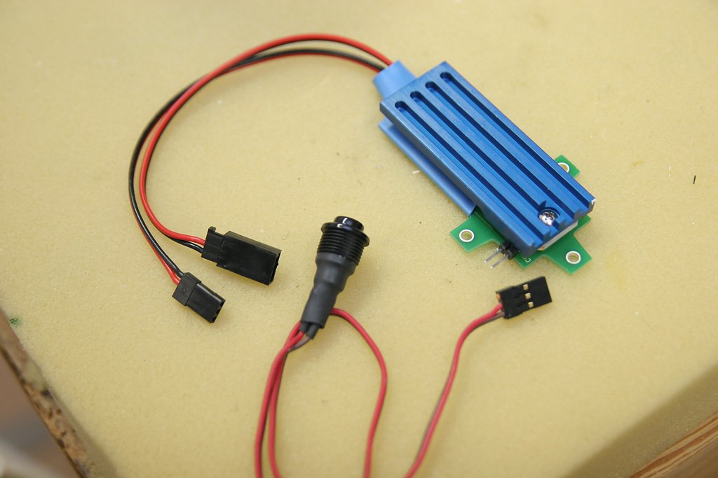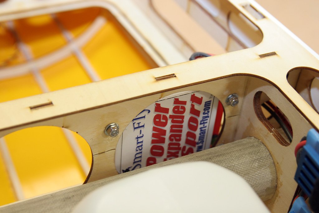 Went to mounting the radio gear on this thing. Going with a www.smart-fly.com Power Expander “Sport.” Why? Because I want more current to my servos than a standard R/C connector can provide (if I ran the battery power direct to the RX without a power distribution system, then all that 16gage wire and Dean’s Ultra connectors would then have to pass through a little 1.9amp standard R/C connector into the RX, to provide all the power to my servos, which by the way, can draw 4amps each). Also, Fromeco Regs all around: