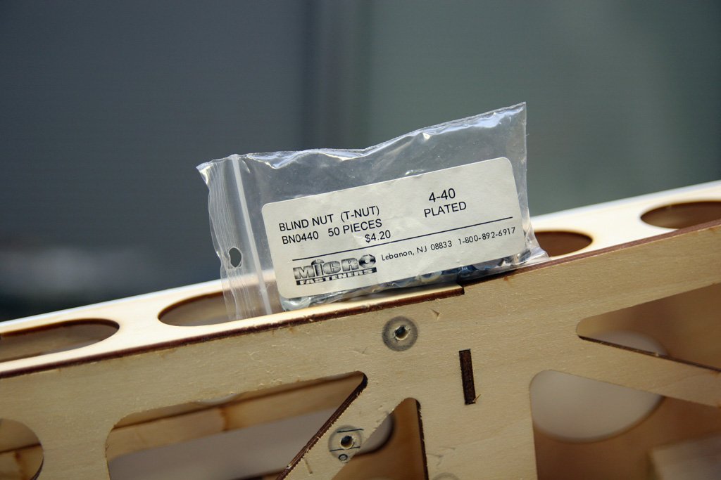 I decided to do the mounting with blind nuts, 4-40 bolts, nylon lock nuts, tygon fuel line spacers, and stuff like that: