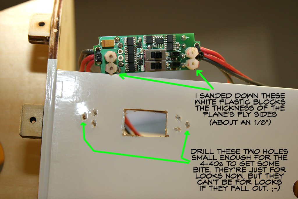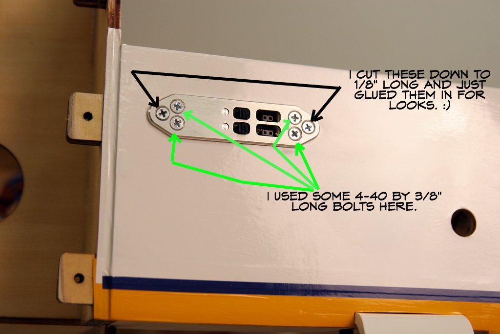 I had already drilled the outside holes to run some 4-40s through them. So I cut down some 4-40s and just glued them in for looks. That way they wouldn’t run into, or cut, the wires on the inside. Anyway, it worked good for me: