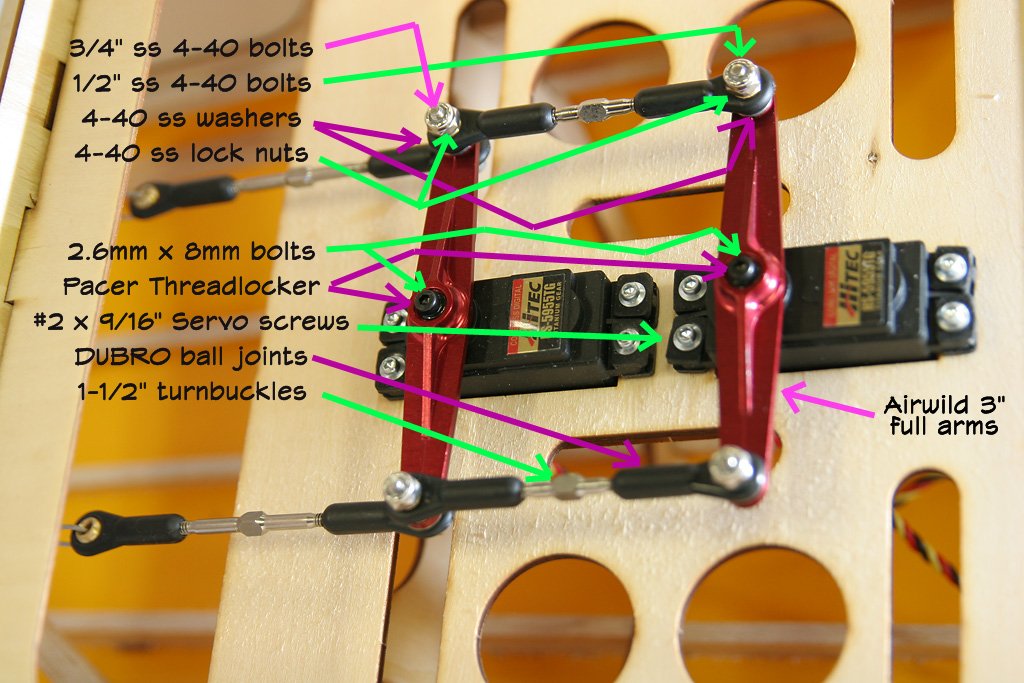 Again, I’ve never talked to Rocco @ Aeroworks about plane setup, ever. But, he seems to understand all these considerations. I keep wondering who learned this stuff first, me or Rocco? lol Example, from the 100cc CD manual… Rocco/Aeroworks shows the pushrod/balljoint underneath the servo arm. Which might look funny to some people at center, but it looks right at full deflection, which is when you really need it. Good job, Aeroworks! Also, Aeroworks is showing heavy duty Hitec plastic servo arms. I’ve seen some GS guys run them lately. Apparently they can take it. I wanted to try them on this plane… but I just can’t get my mind around it. lol: