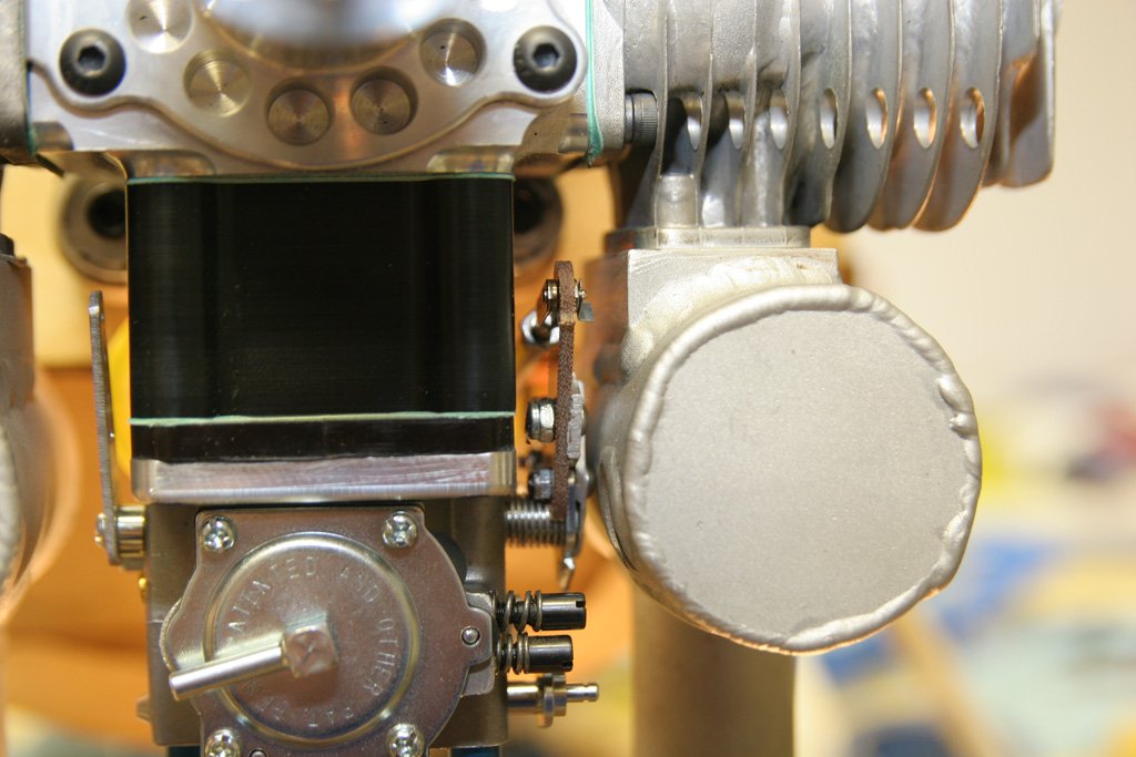 Well, ain’t much room between the carb and the standard mufflers. Had all the geometry and resolution perfect… but I’ve seen balls melt when they’re that close. Could have offset the throttle arm and went with a metal clevis, I’ve done that before. Anyway, here’s what I have setup right now: